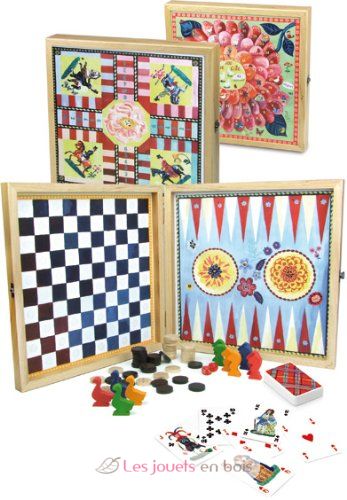 Superb set of traditional wooden board games with illustrations by Nathalie Lété. Game of Draughts, Ludo, Backgammon, Goose Game and a deck of cards. Made in France.