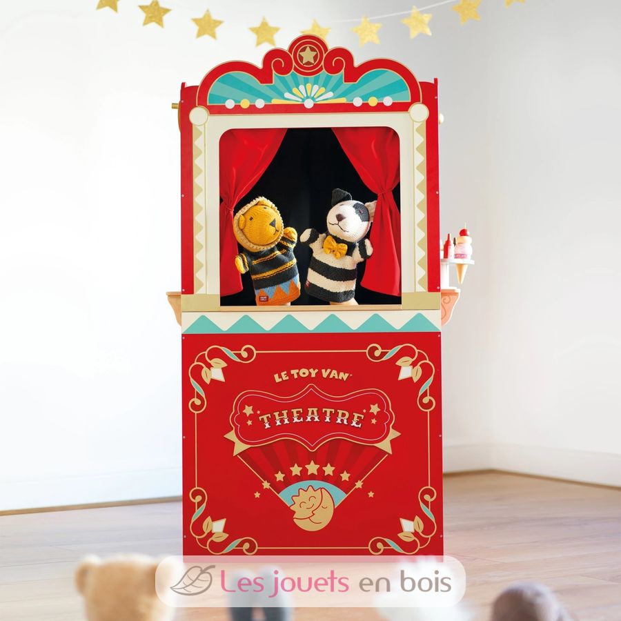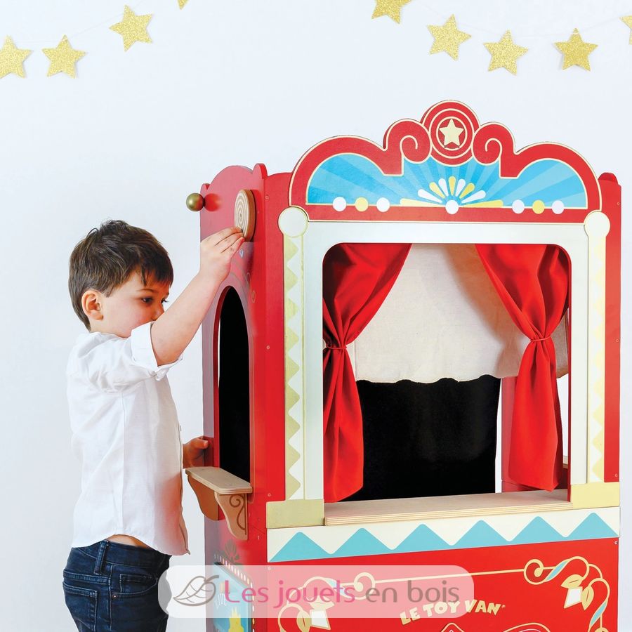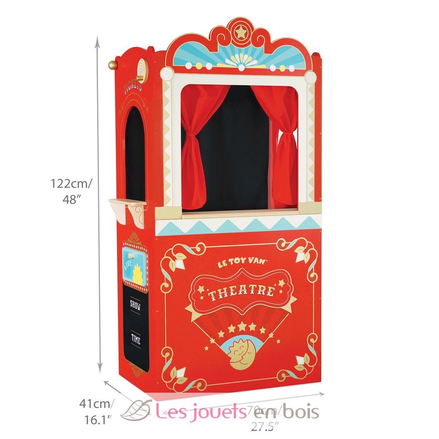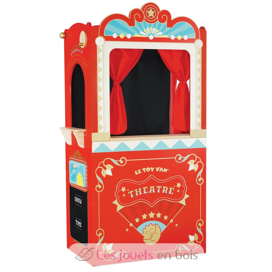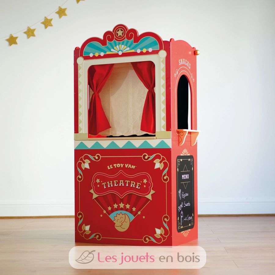 It's showtime! This retro wooden puppet theatre features a live and interval reversible sign, a stage door and two chalkboards. The theatre is finished with theatre curtains including red stage drapes, a black backdrop curtain and a winding act curtain. There are 3 different scenario windows including a performance window, a snacks window and tickets window.