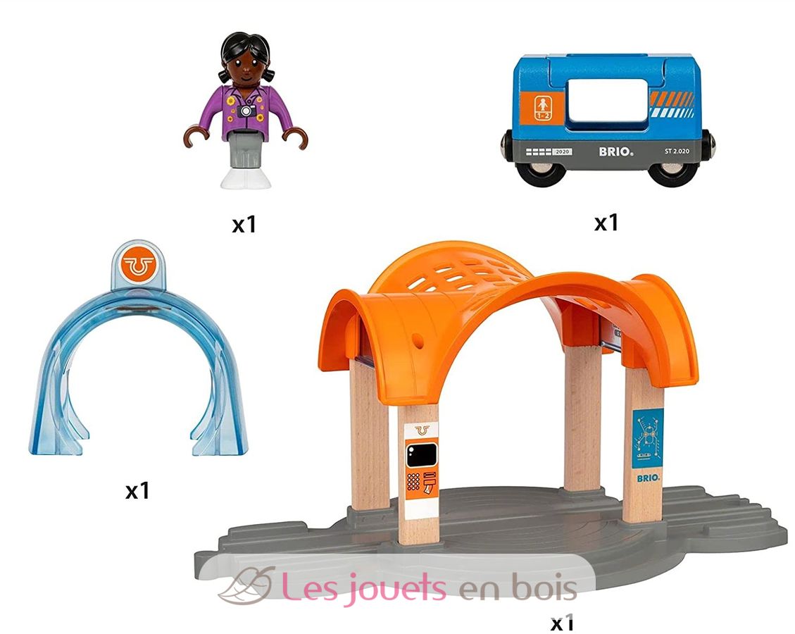 33973 Smart Tech Sound Action Tunnel Station includes 4 pieces: 1x Action Tunnel Train Station, 1x Station Action Tunnel, 1x Travel Wagon, 1x Passenger.