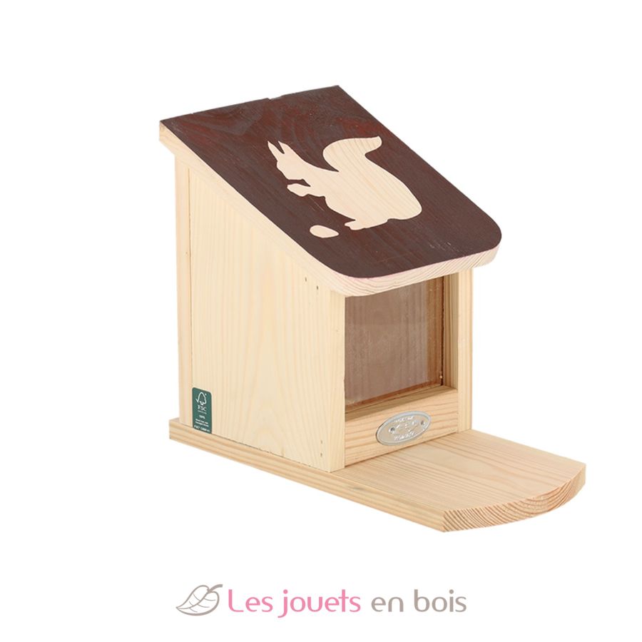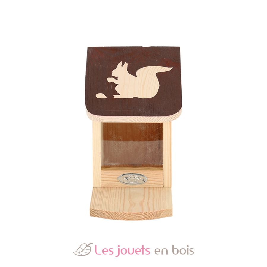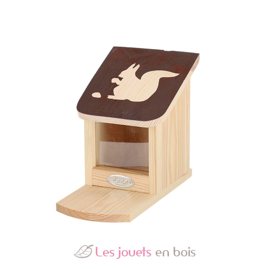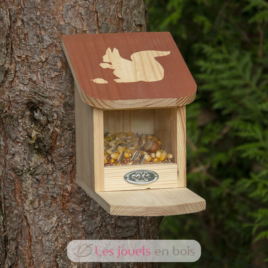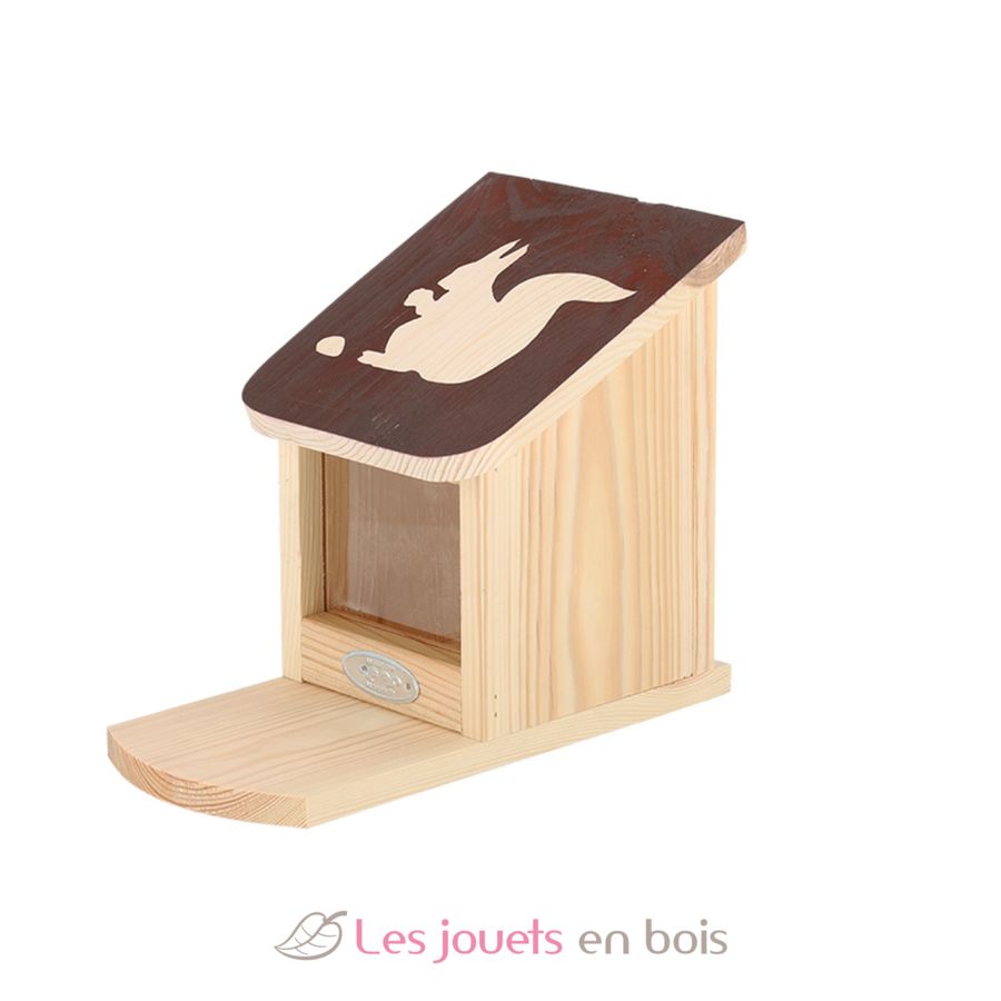 This squirrel feeder is a cute feeder made of pine wood, featuring a colorful roof with a squirrel silhouette (sold without food).