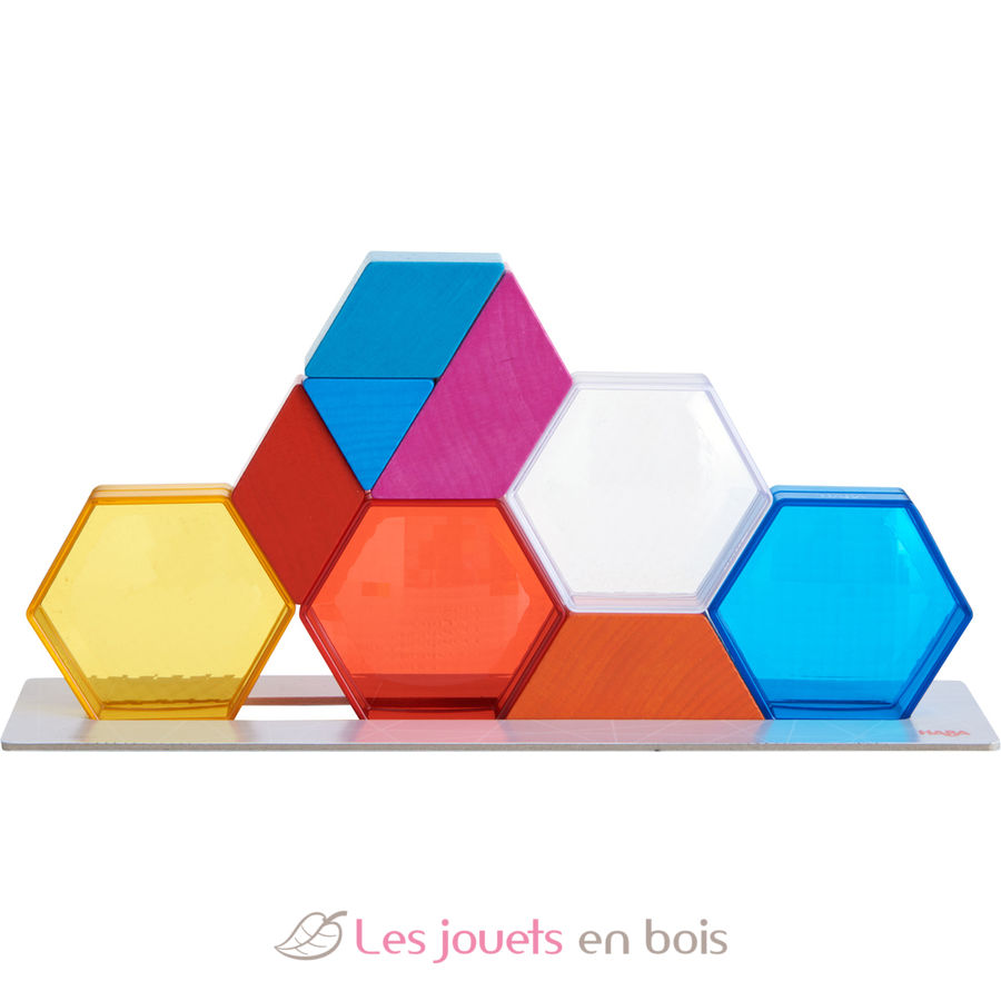 Stacking game Color Crystals, includes 12 double-sided template cards of 3 varying levels of difficulty, made by Haba. Item number 304736.