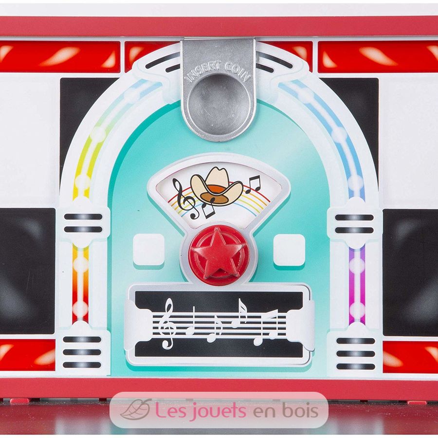 It's twice the fun at the Star Diner! This sturdy, double-sided wooden play space lets kids cook and serve from the kitchen side, and order and enjoy a meal on the booth side. The kitchen, with an extra-large oven, realistic burners and dials, a two-shelf refrigerator, and plenty of counter space has fun details like a drink dispenser and milkshake maker with mixing rod that can be pushed up and down. At the two-seat booth, customers three and older can spin the jukebox dial to choose their favorite type of music, then drop the included coin in the slot - and the coin lands in a collection tray on the other side!