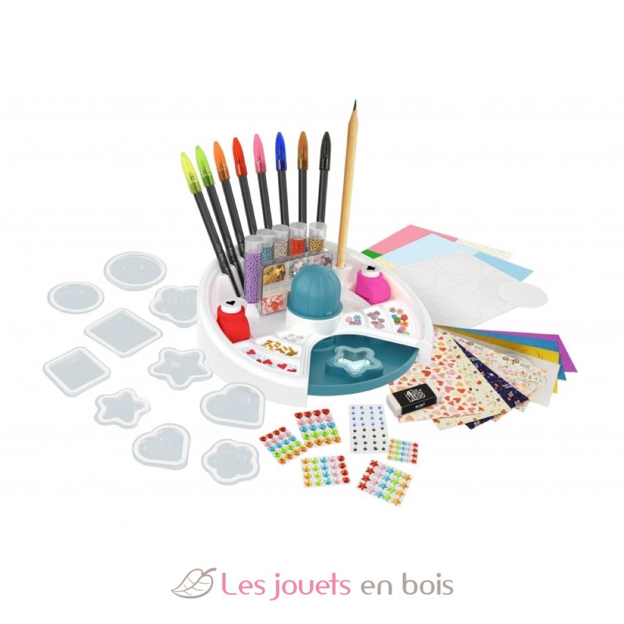 Included : 1 workstation, 10 small shells, 10 big shells, 8 markers, 1 pencil, 5 tubes of mini-beads, 1 box of decorations, 2 hole punches, 1 rubber, adhesive eyes, self-adhesive diamanté, 2 sheets of printed paper, assortment of self-adhesive cards (plain and printed) and 1 instruction sheet with colour illustrations.
