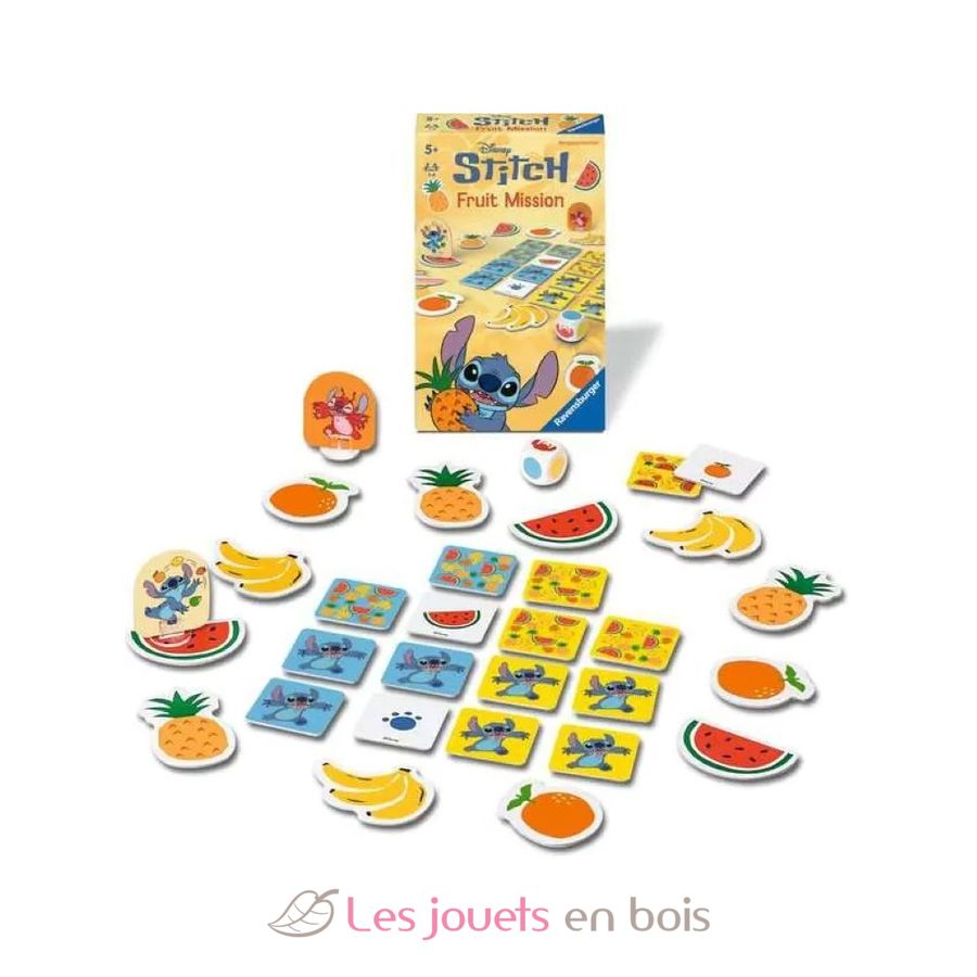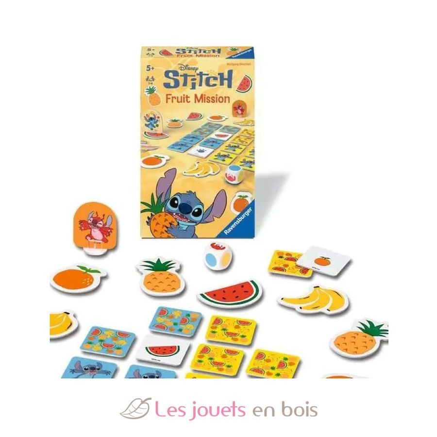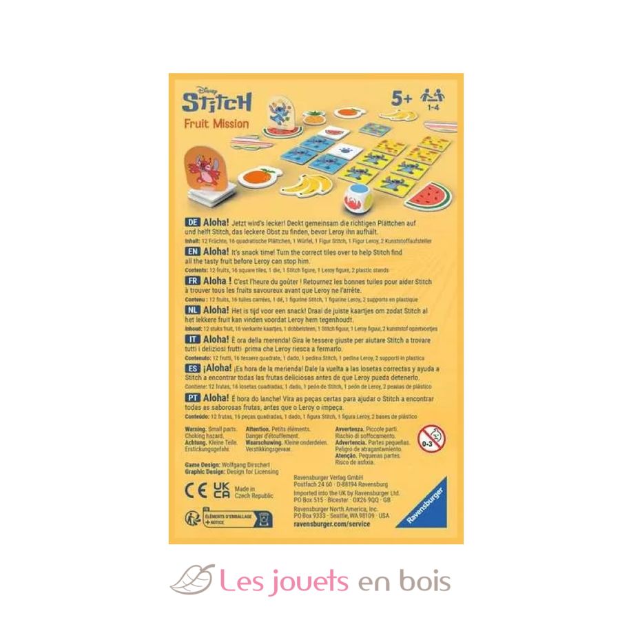 Contents: 12 fruits, 16 square cards, 1 die, 1 Stitch figure and 1 Leroy figure with their plastic stands, 1 rulebook.