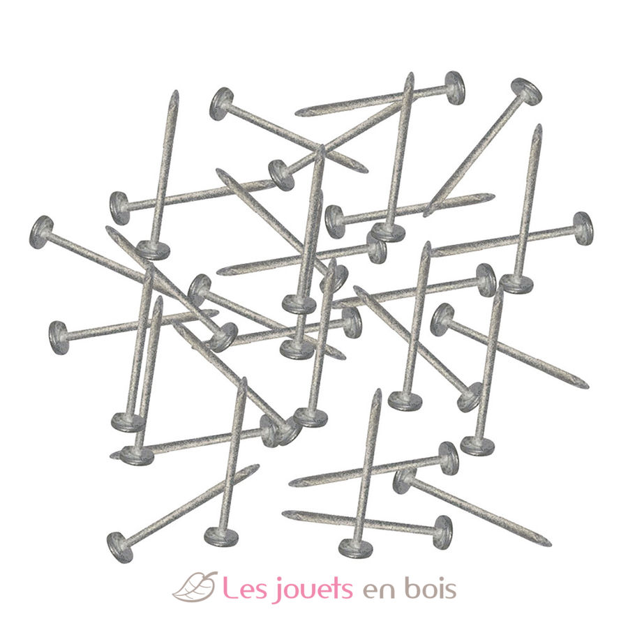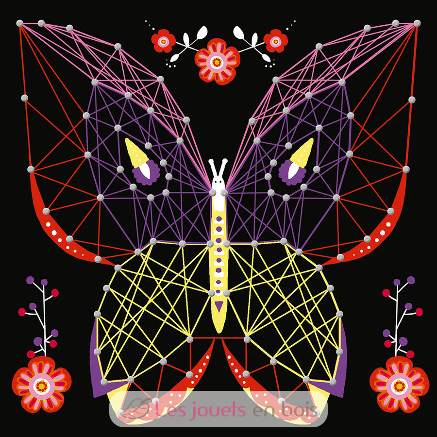 The box contains: 4 foam boards 12.5 x 12.5 cm, 1 foam board 25 x 25 cm, 800 nails, 10 skeins of thread (7 m), 1 tool and an instruction booklet. Pretty creations to decorate a room!