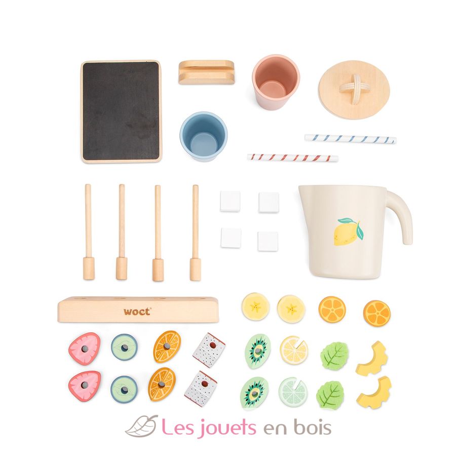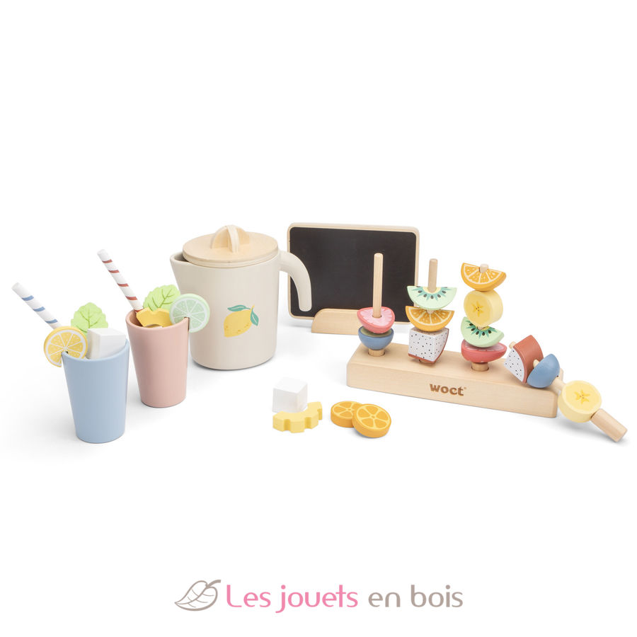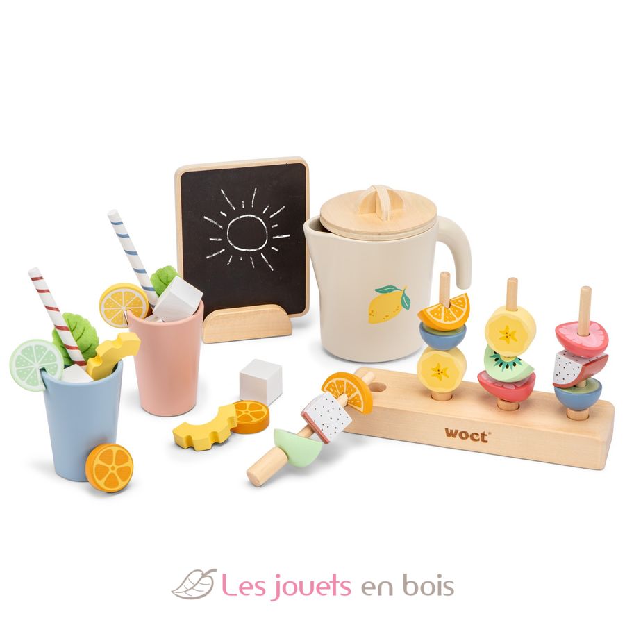 The set includes two cups with fruity mix-ins and pretend straws, a lemonade pitcher with lid, a chalkboard sign for daily specials, and four wooden skewers with a stand, plus a rainbow of fruit slices to create delicious pretend combos. As children pour, garnish, and roleplay, they build fine motor skills, spark creativity, and enjoy endless open-ended fun. A refreshing and playful addition to any pretend kitchen! This toy is made from FSC 100% certified wood.