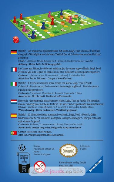 The goal of the game is to reach the castle with your 3 pawns before the other players. On your turn, roll the dice and choose one of your pawns to move as many spaces as indicated by the die. The rules are simple and easy to understand, making it the ideal board game for family fun. After a few games, kids can even play together without adult help. With its small size, you can slip Super Mario Barricade into a small bag and take it anywhere, even on trips. Is everyone ready? Then the race can begin!