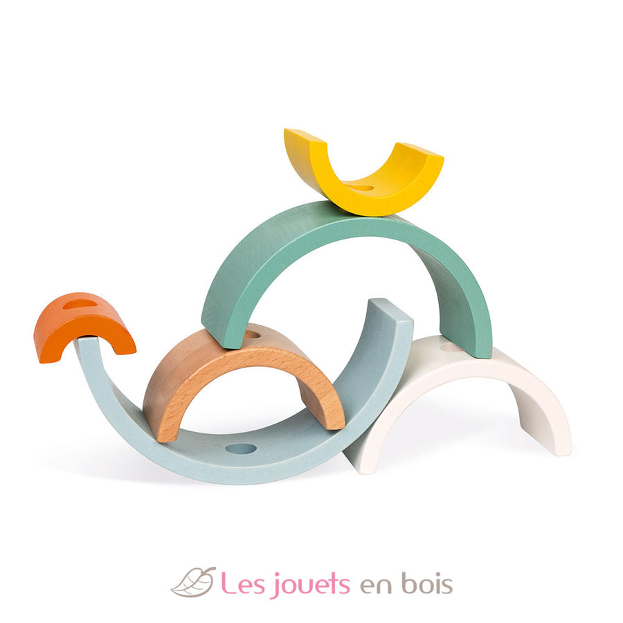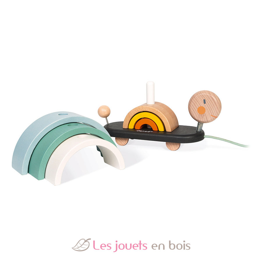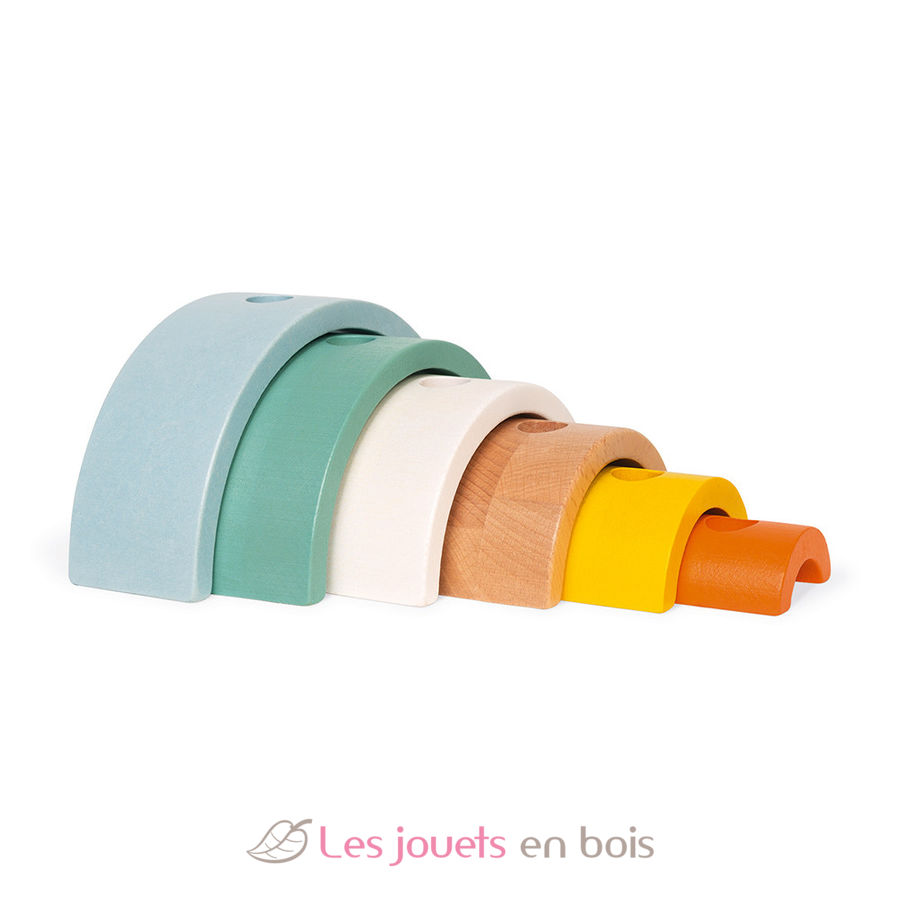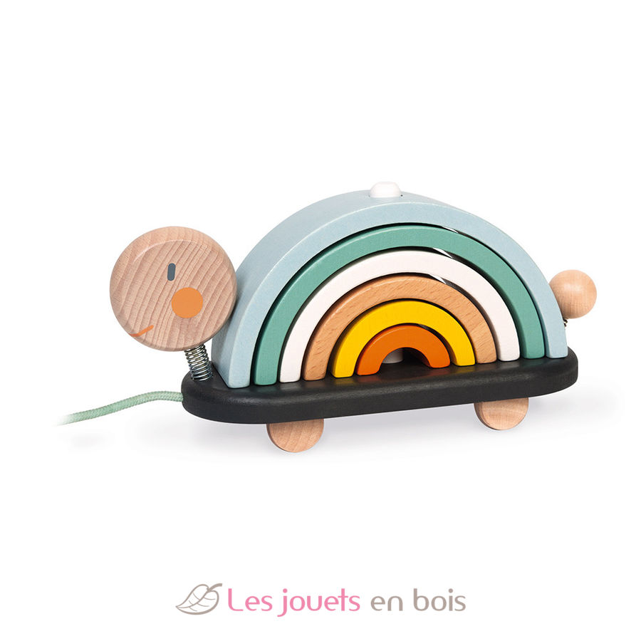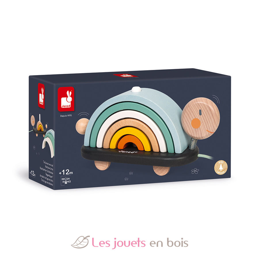Your child will love to walk this pretty wooden turtle with its rainbow shell composed of 6 wooden arcs of circles. The rainbows pile up at will to form an original construction game.