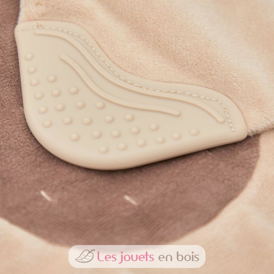 Soft cuddly toy to comfort baby, equipped with a silicone part with bumps and grooves to soothe sore gums.