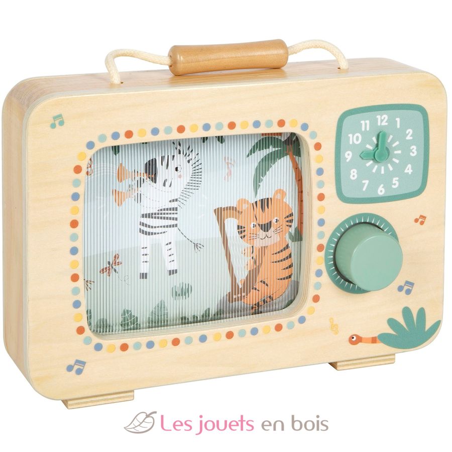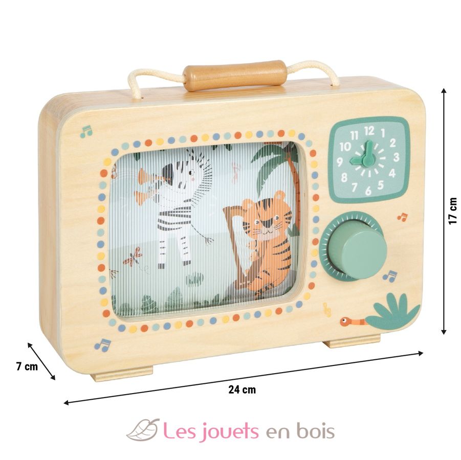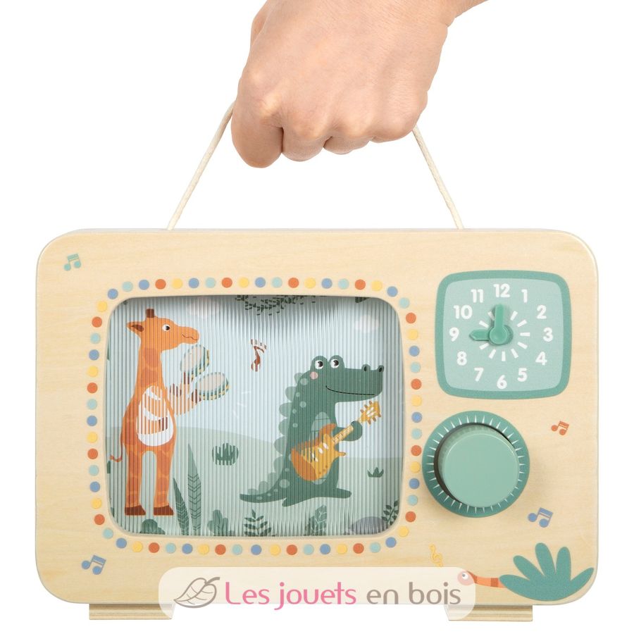 With this large music box in TV format made of FSC-certified wood, children can experience how the orchestra of cheerfully playing safari animals comes to life.