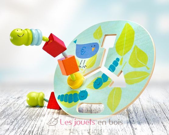 The hungry worm wants to eat its way through the fruit and leaves in the garden! Who can manage to push and turn the worm, either through calculation or by trial and error, so that the colourful geometric wooden elements can be pushed through the correct holes?