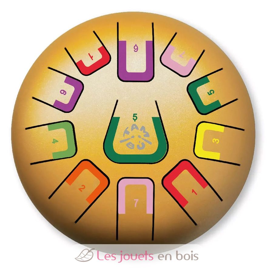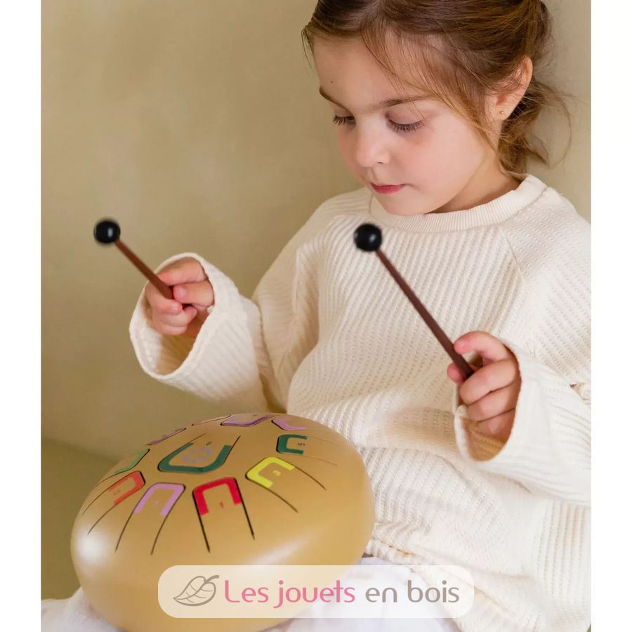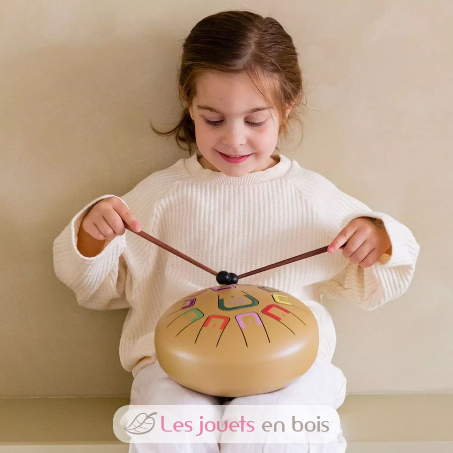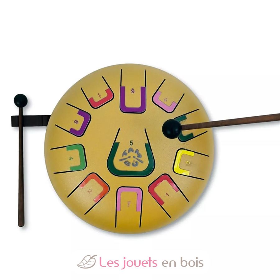 This drum has 11 notes, differentiated by numbers and colors, that emit relaxing harmonic sounds. It can be played in different ways, each producing a different sound intensity: with sticks, with fingerpicks, or hands.