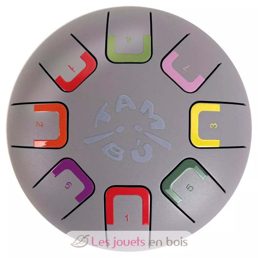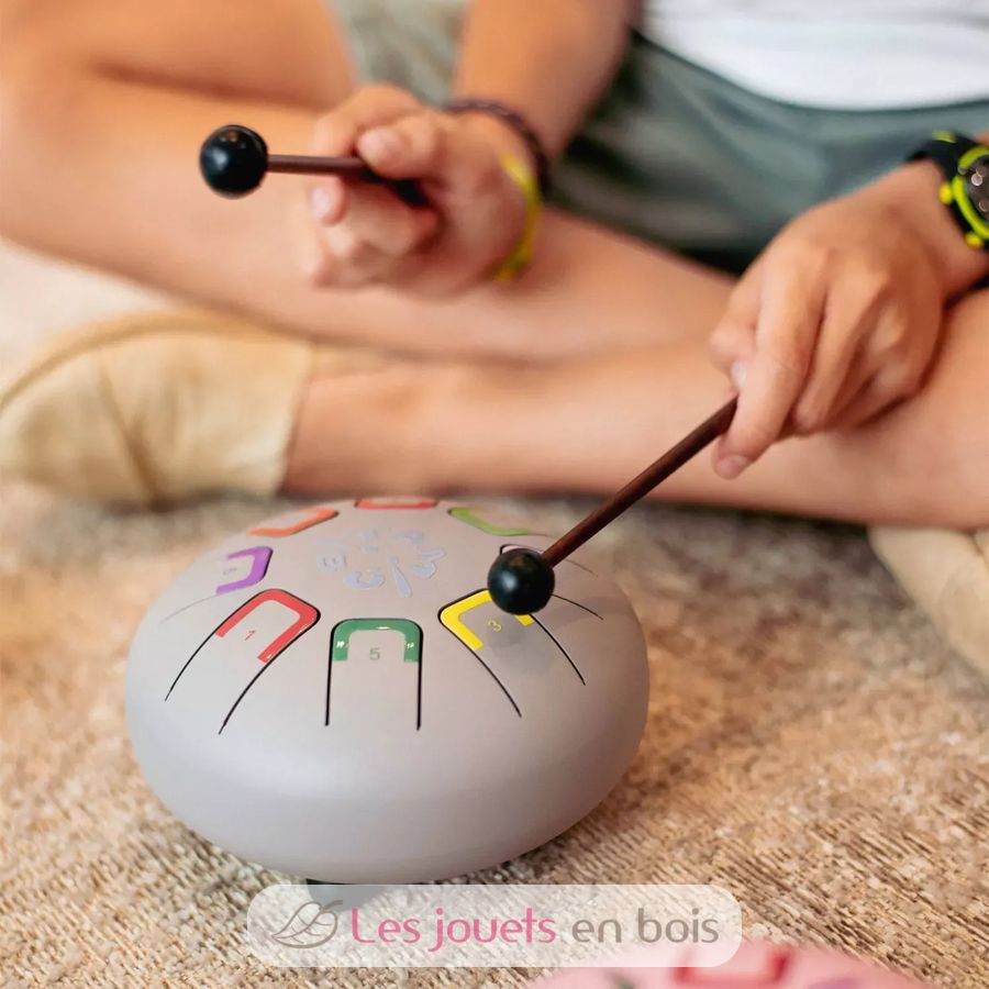 This drum has 8 notes, differentiated by numbers and colors, that emit relaxing harmonic sounds. It can be played in different ways, each producing a different sound intensity: with sticks, fingertips, or hands.