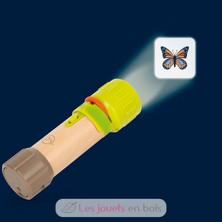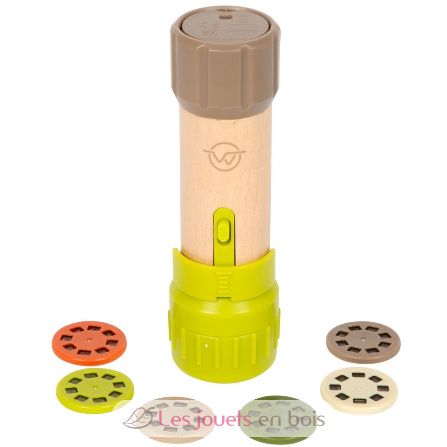 The child-friendly torch in an ergonomic format, made of robust plastic and with a natural wood handle, is packed with knowledge: six interchangeable film wheels show various scientific topics such as the development cycle of frogs, butterflies and dandelions, leaves and fruits of trees, animals and their footprints, and constellations. Perfect for young naturalists!