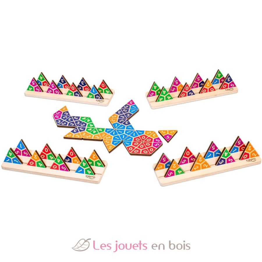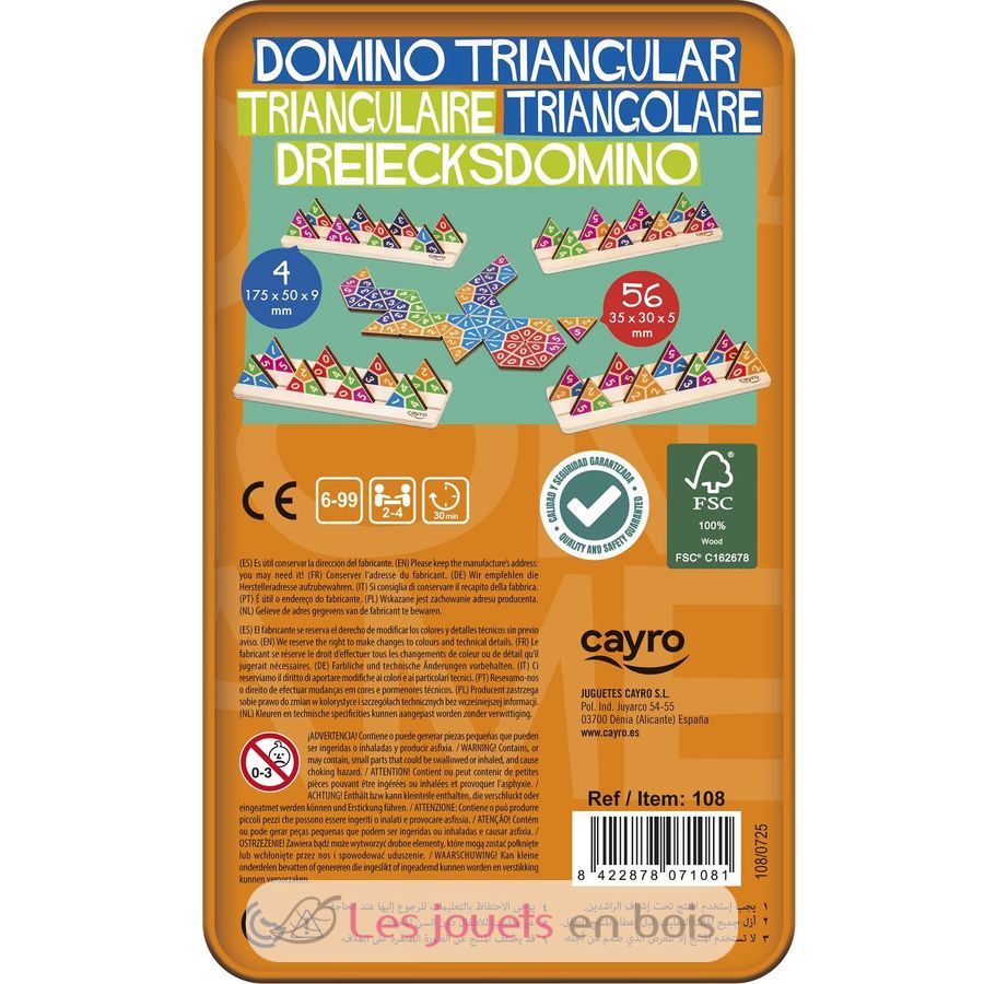 Contents: 4 boards measuring 17.5 x 5 x 0.9 cm, 56 triangular dominoes measuring 3.5 x 3 x 0.5 cm, and a rulebook. For 2 to 4 players. Ages 6 and up.