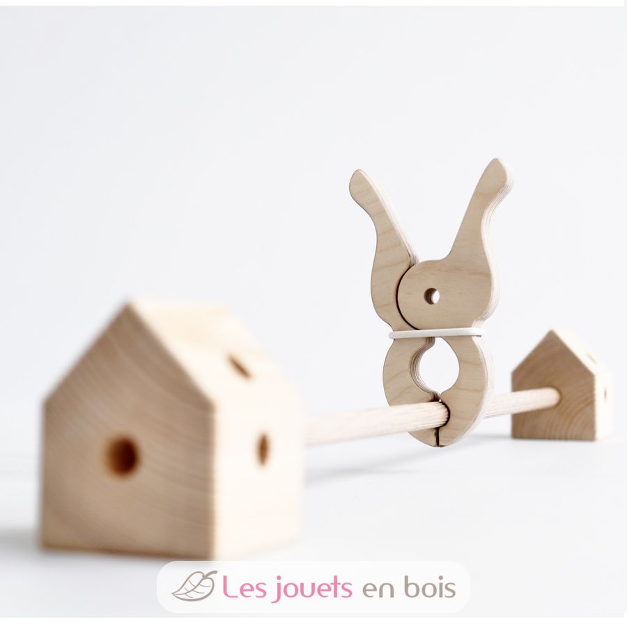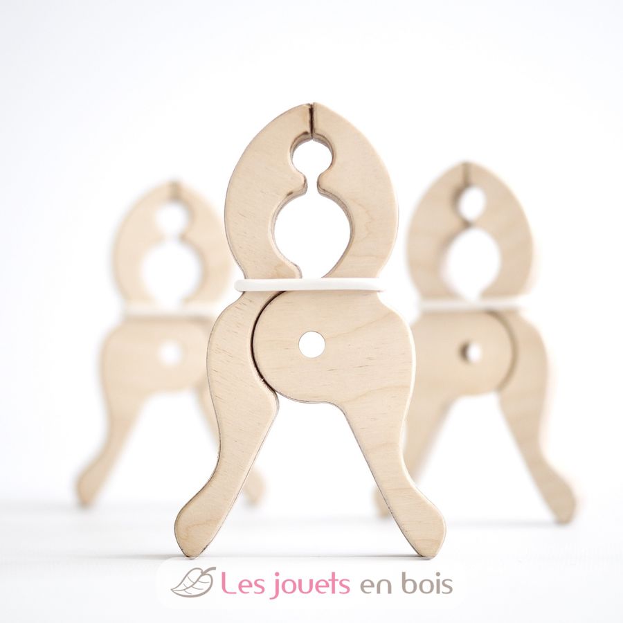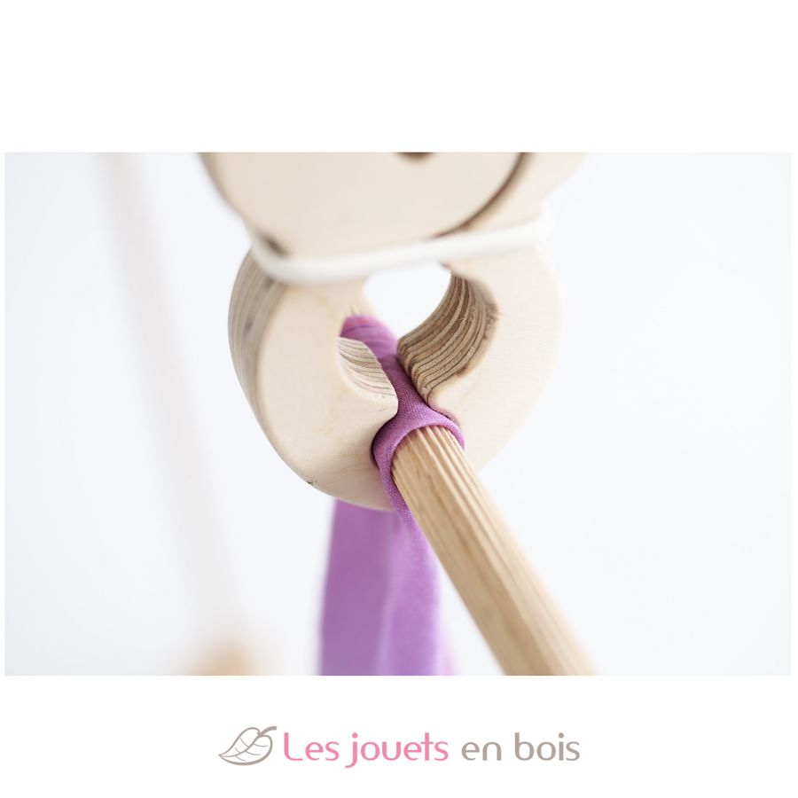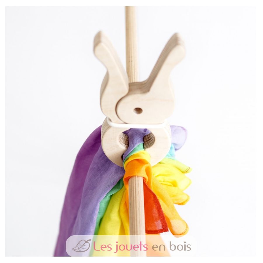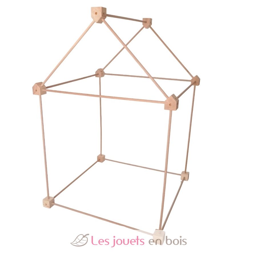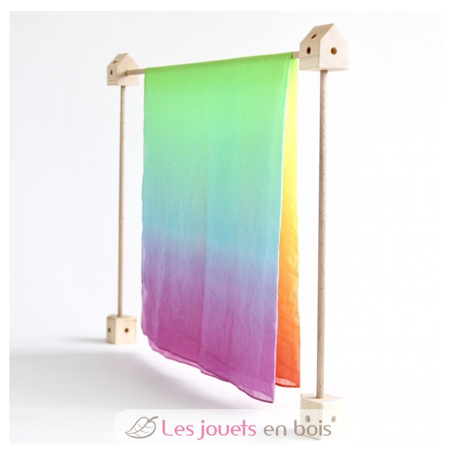 Unlike the majority of Trigonos construction which include tailor-sized pieces of fabric to combine with the wooden pieces, the Big Start proposes using sheets, sarongs, scarves, etc. that you may have at home to decorate whatever structures you can imagine. The set includes a beautiful organic cotton fabric with a rainbow pattern, as well as four giant play clips.