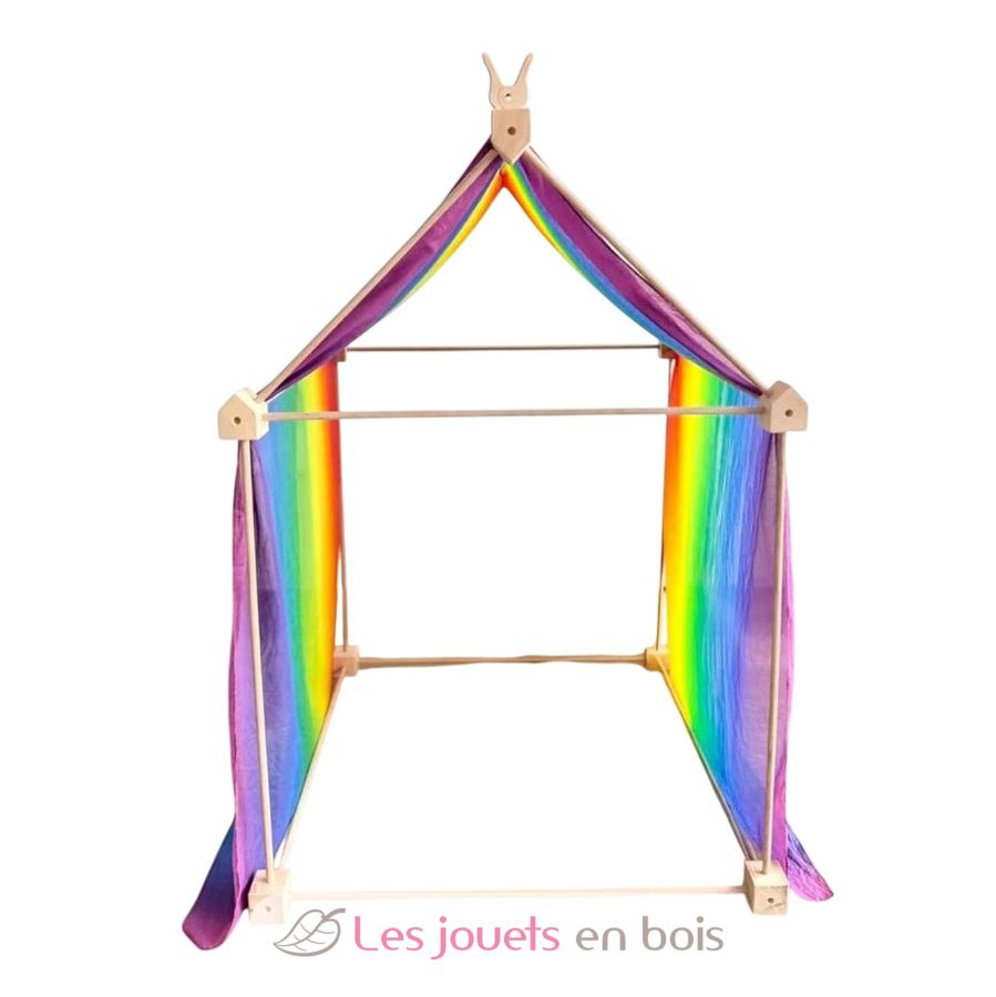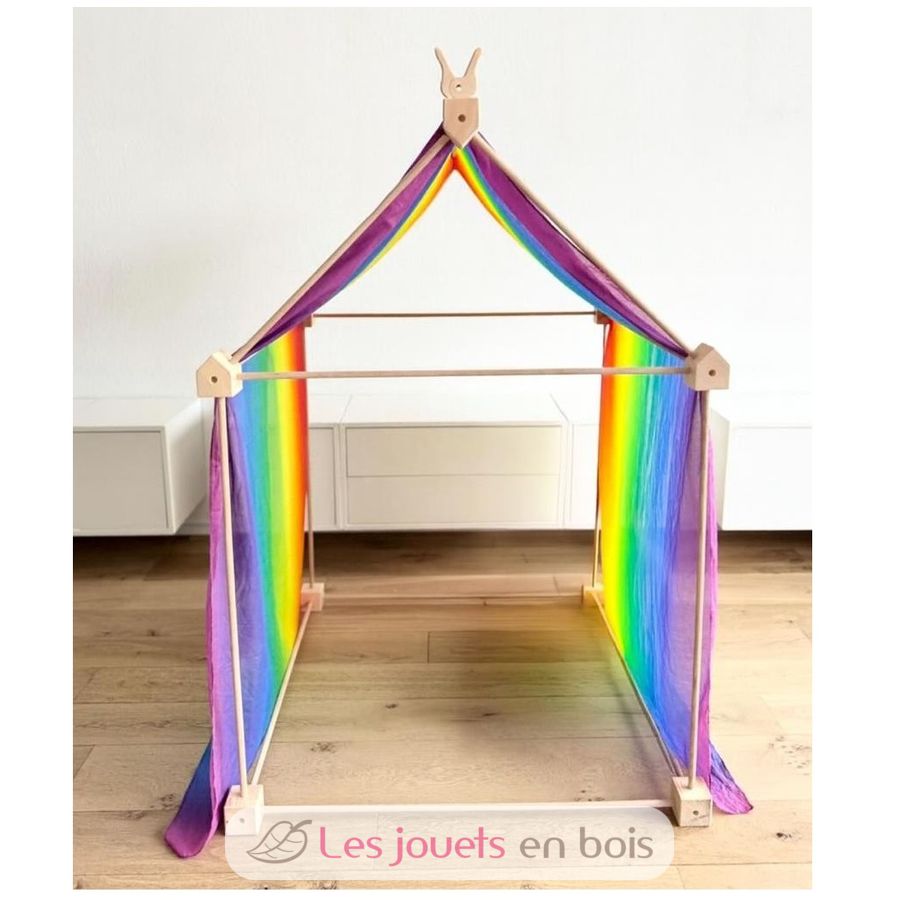 The Trigonos Big Start Rainbow is a wooden playfort construction set for kids, with a total of 32 pieces that combine sticks, blocks, giant clips, and a beautiful organic cotton fabric in rainbow colors.