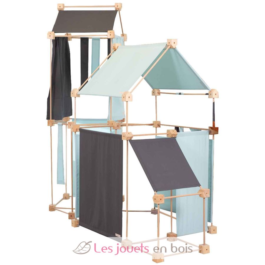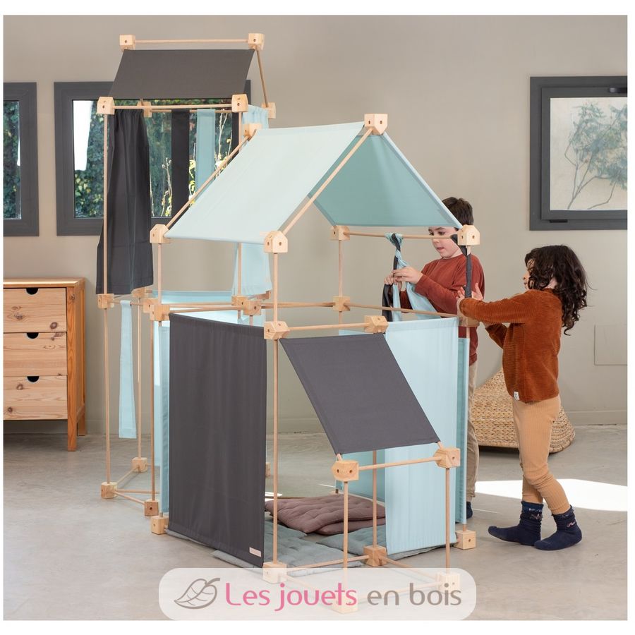 Trigonos Maxi includes 150 pieces : 20 blocks, 20 pentagons, 80 sticks in four lengths and 30 pieces in light turquoise and grey organic cotton fabrics. Comes in a cardboard box.