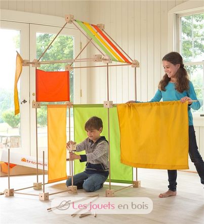 Trigonos Maxi includes 150 pieces : 20 blocks, 20 pentagons, 80 sticks in four lengths and 30 pieces of fabric. Comes in a wooden box.