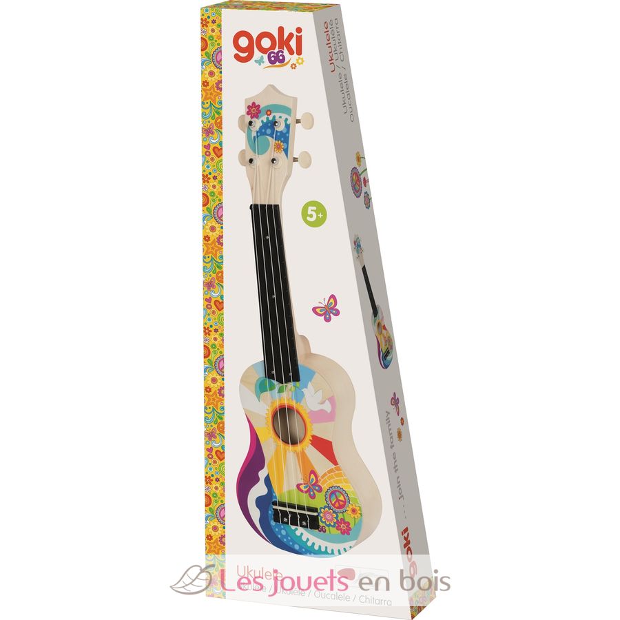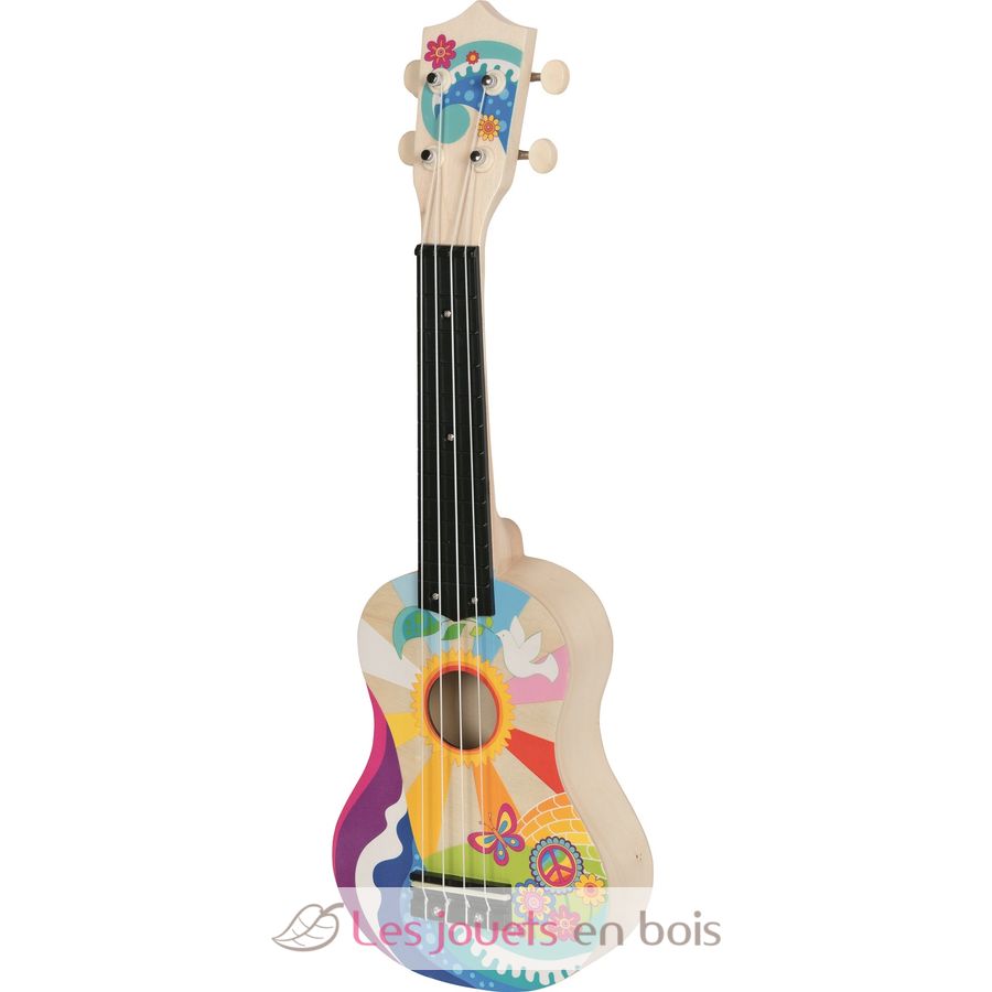 Decorated in bright colors, this wooden ukulele for children is designed to offer a fun musical experience for children aged 5 and up.