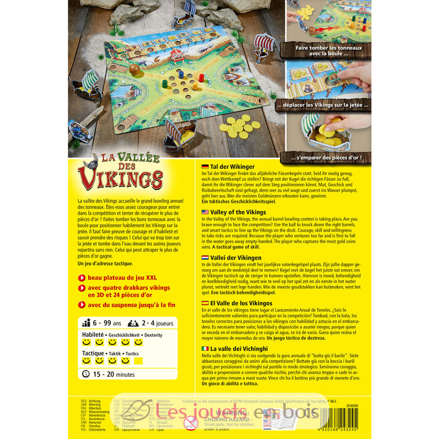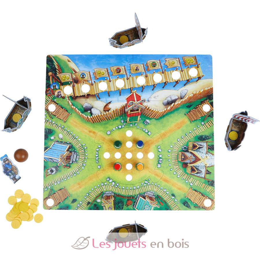 Content : 1 large Viking Valley game board (to be pieced together from 7 parts), 8 Viking flags, 4 Viking tokens, 1 cardboard bat, 4 ships (each to be assembled from 4 cardboard sections), 1 bowling ball, 24 gold coins, 4 wooden barrels, 1 rulebook.
