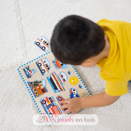 Sound puzzle for children made up of 8 wooden pieces. Each shape emits the vehicle's sound when the piece is correctly placed on the puzzle. The little ones love it!