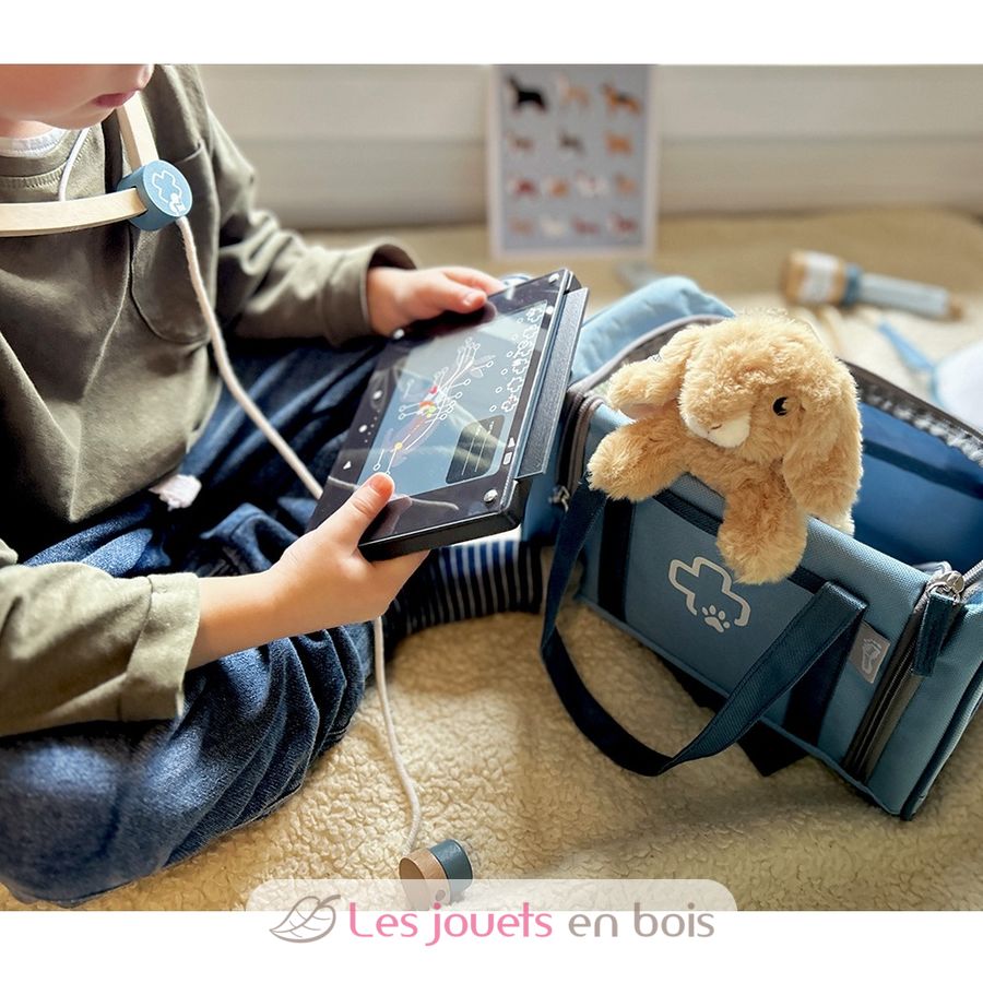 The extensive range of accessories offers everything young veterinarians need: a stethoscope, thermometer, otoscope, syringe, bandages, protective collar and even a tablet for viewing X-ray images, including four X-ray images (dog, cat, rabbit, horse). The X-ray plates also have a check-up form printed on the back. Tick tweezers, tweezers, medication and a vaccination card complete the set, along with an appointment card and medical history form, while the A5 poster featuring various dog breeds can be hung up in the ‘veterinary practice’ in true style. Particularly practical: the bag not only serves as a transport box for the rabbit, but also as a useful doctor's bag that keeps things tidy and brings mobility into play.