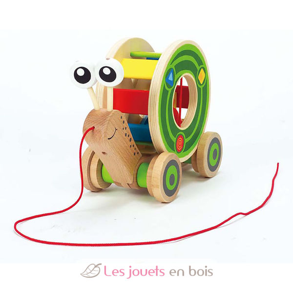 This multi-tasking snail totes a shell full of wooden blocks as he tags along behind you. Lighten the load by removing the colorful shape sorter, and he’s ready to roll alone.