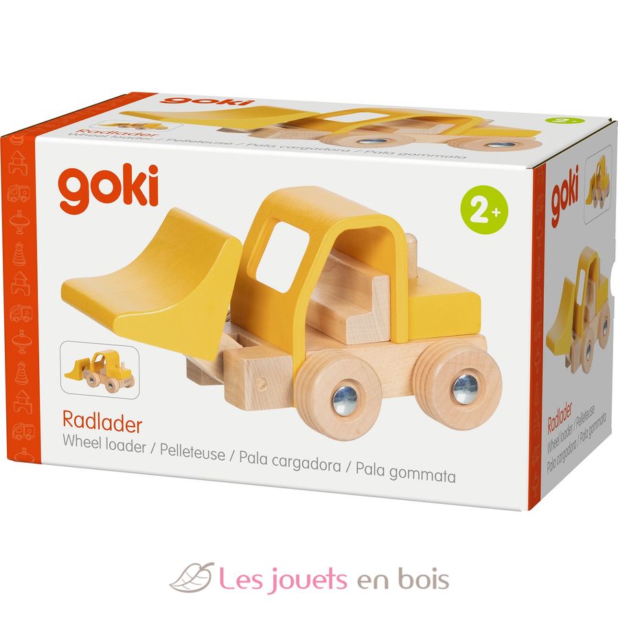 Wheel loader yellow, wooden vehicles made by Goki.