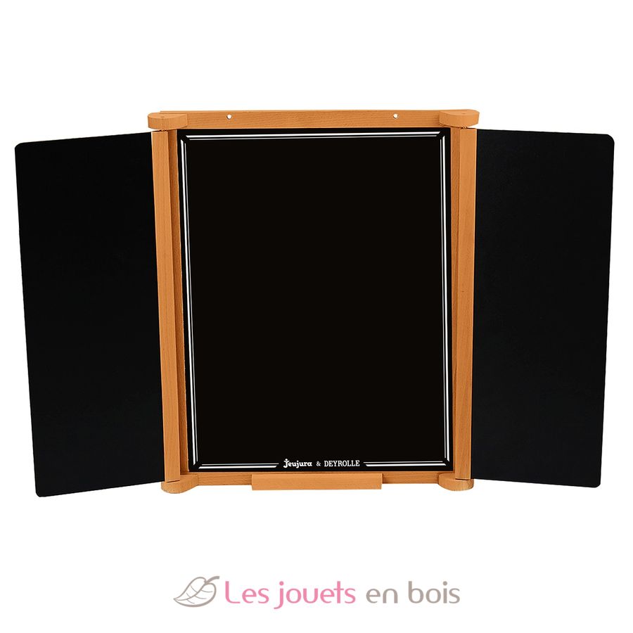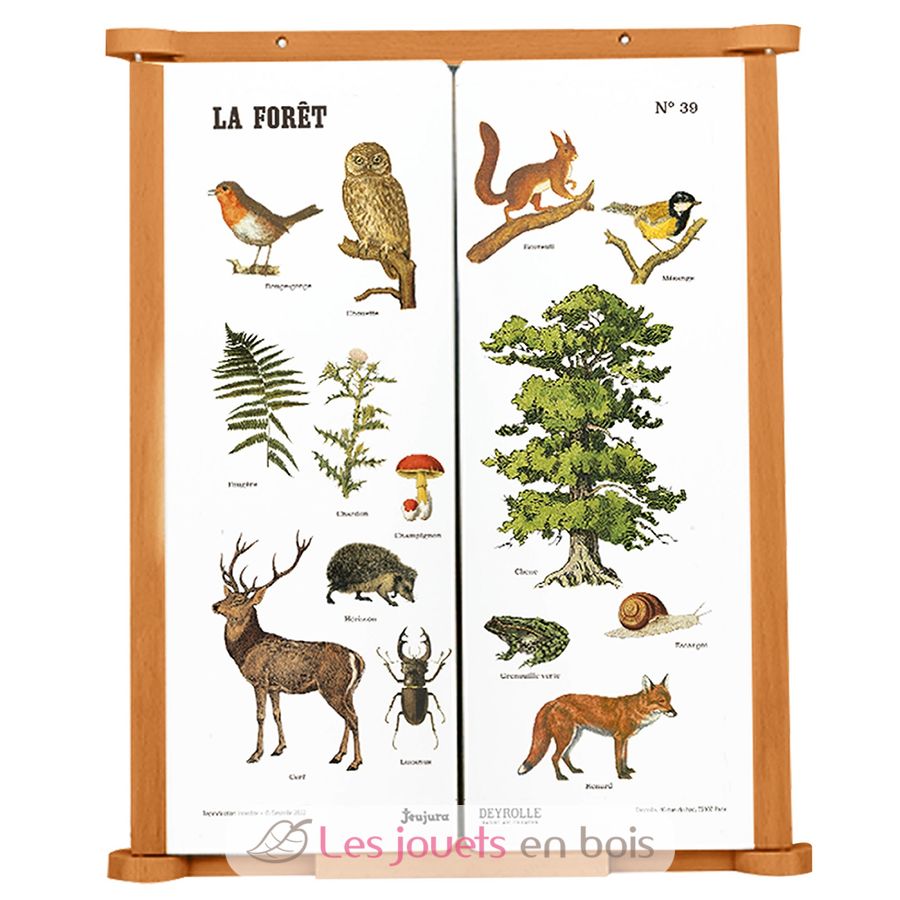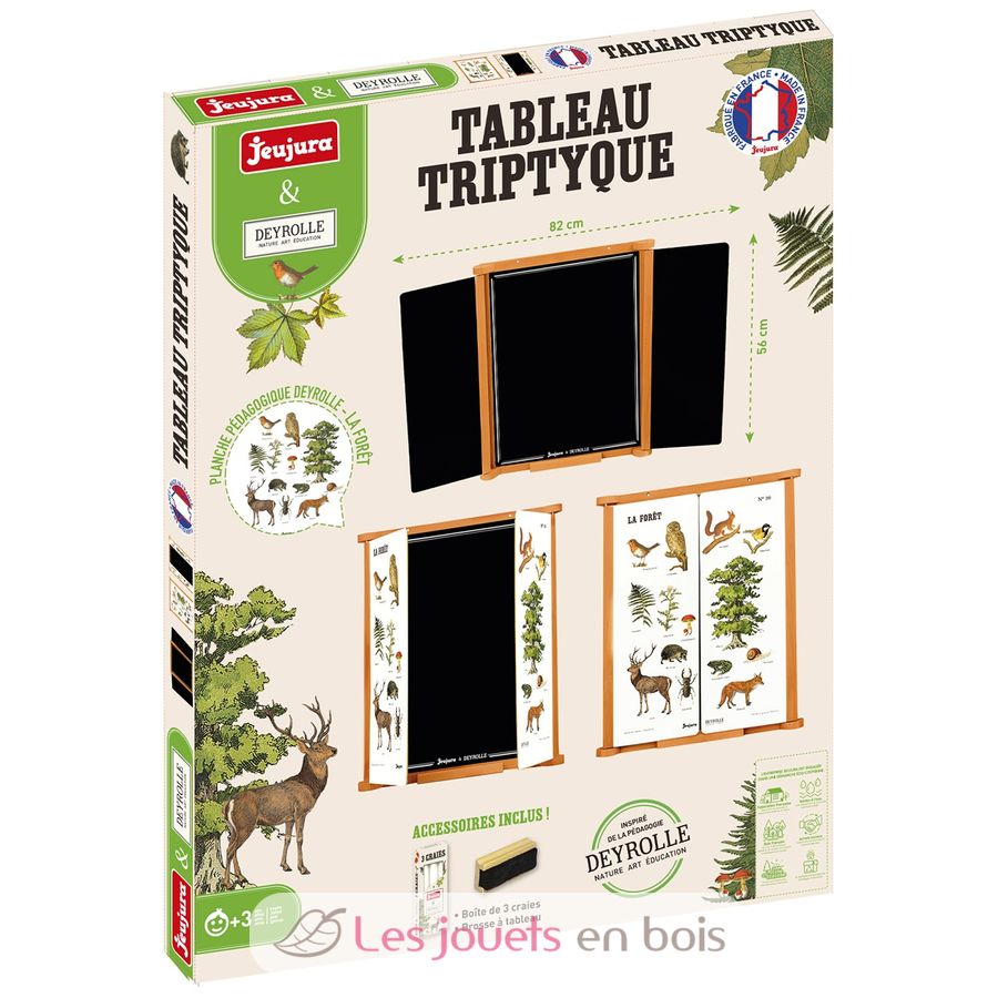 This wooden chalkboard consists of a central slate for writing with chalk and two panels, one side for chalk and the other with an educational board about the forest created by Deyrolle. It comes with accessories: a box of three chalks and a blackboard eraser.