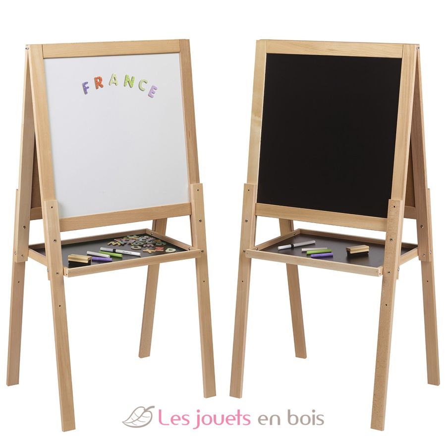 This schoolboy easel has two different faces: a slate board for writing and drawing with chalk and a magnetic board for magnets and erasable pens.