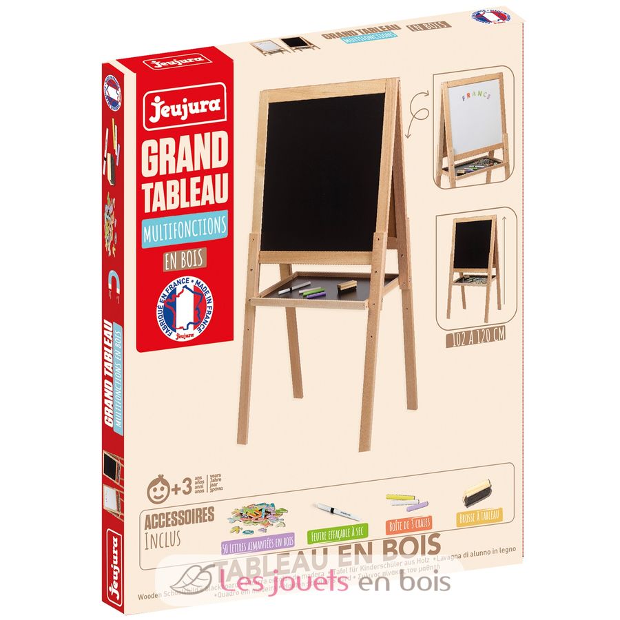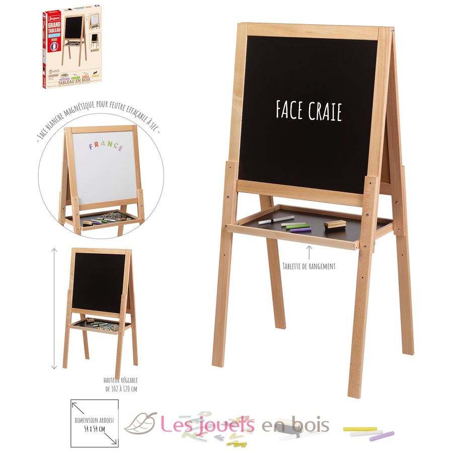 This school board comes with accessories: wooden magnetic letters, a box of 3 chalks, a brush and a dry-erase marker.