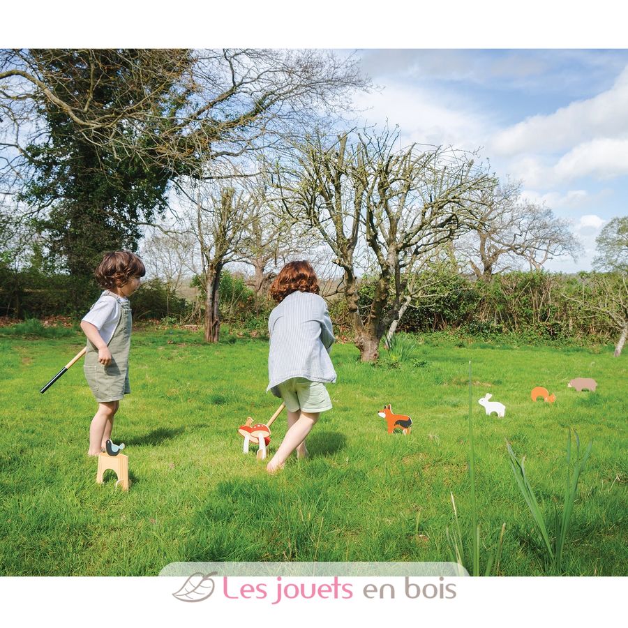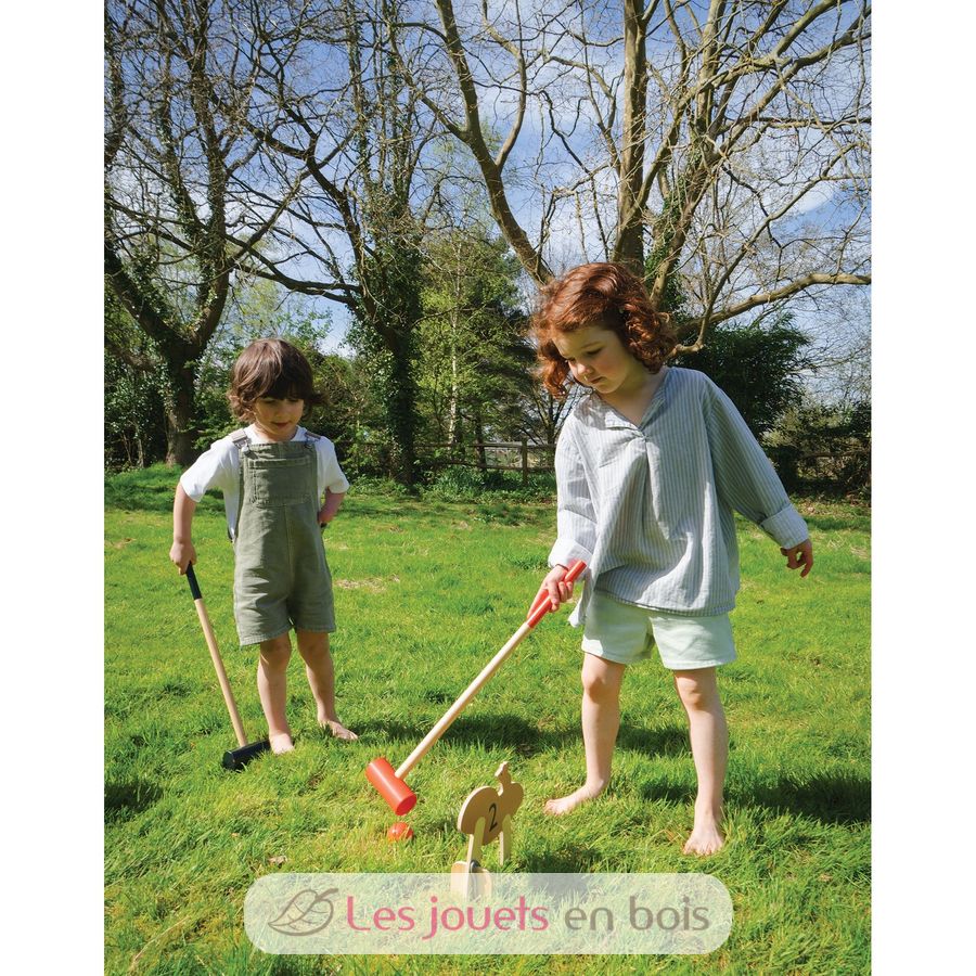 Contained in a practical printed canvas bag with shoulder handle, this wooden croquet game comes with 6 hoops, 2 mallets (52,5 cm) and 2 balls.