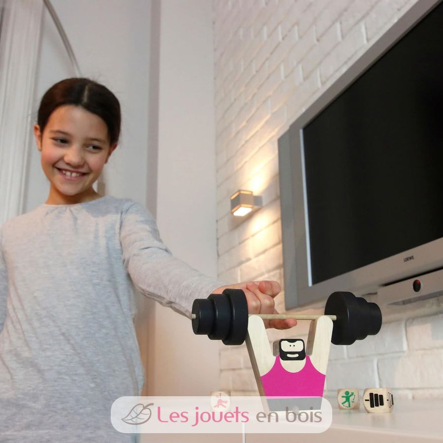 Take turns to position the weights, shown on the weight die, on the barbell and then put the barbell on the wooden athlete. Throw the personal trainer die (the green die has easier exercises, the red die harder ones) and, lifting the barbell with two fingers together, tackle the task shown. The winner is the player who correctly completes the most tasks without the weights falling!
