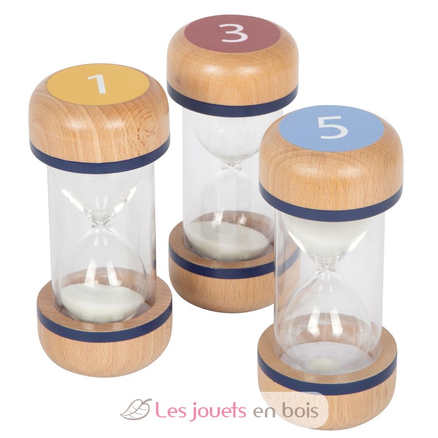 This set of 3 hourglasses made of robust beechwood (1, 3 and 5 minutes) is a great aid for visualising time for children in kindergarten, preschool, and primary school.