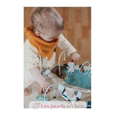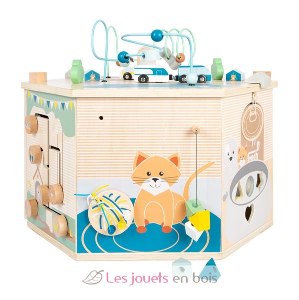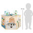 This activity cube with 8 playable sides offers long-lasting playtime fun and imparts knowledge about what life is like with pets! Children will train their motor skills on the sliding labyrinth, the shape-fitting game, the spinning tiles game, and the detachable threading/colour sorting game - all with the visual theme of everyday life with pets! The construction game with screws and tools promotes the development of dexterity, and the doorbell/gate latch provide acoustic stimulation. The highlight is the reversible lid with a chalkboard that can be mounted without tools which depicts a fun camping trip on the reverse side with bead mazes and train tracks. Tip: the lid can also be used as a surface for painting or playing on the floor!